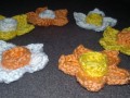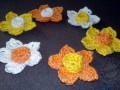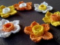 Sada háčkovaných květů z bavlněné příze v barvě žluté, bílé a oranžové. Sada obsahuje 6 květů, každý květ je jinak barevně poskládaný.