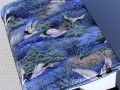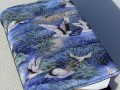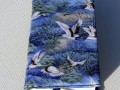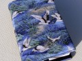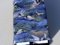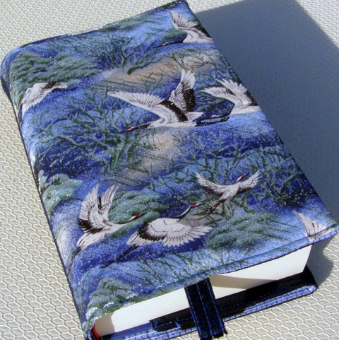 Obal je ušitý ze zahraniční královsky modré látky se vzorem ibisů/jeřábů se stříbrotiskem + kovově lesklé "brokátové" látky. Všitá záložka.