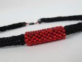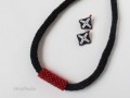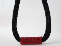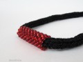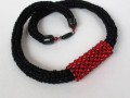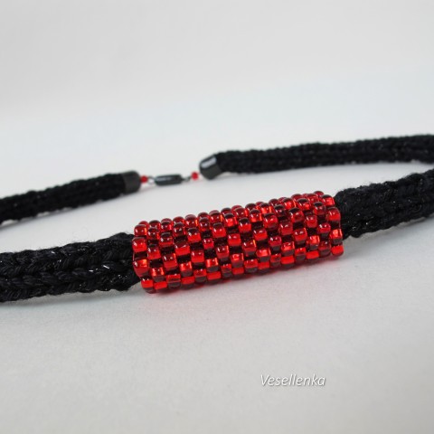 Je vytvořen technikou ručního pletení na cívce z černé bavlněné příze v kombinaci sčernou efektní přízí, doplněn dutinkou z červeného rocailu. Bezešvá dutinka je měkká a ohebná, ale přitom pěkně drží oblý tvar kolem krku, lehce se přízpůsobí vašemu tělu, je mírně pružná. Efektní příze je ze tří čvrtin z viskózy a je pletená, nikoli skaná (kroucená) jako většina "kovových" přízí, a tak z ní "nečouhají" metalická vlákna. Proto je podajná a měkká, příjemná kombinace s bavlnou.