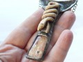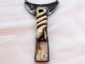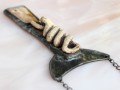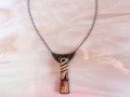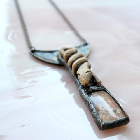 Hadí amulet starobylého vzhledu je vyroben z růžového opálu, z mnou modelovaného (nikoli tlačeného do formy) keramického střepu a z mědi a cínu technikou tiffany (cínování). Celková velikost přívěsku je 8 x 4,7 cm a je zavěšen na 42 cm dlouhém šedočerném řetízku. Zapínání je na větší karabinku. Kámen má v sobě drobné přírodní prasklinky a dírečky - nejedná se o vadu kamene. Mimo řetízku a karabinky je vše ruční práce a jedná se o autorský šperk. Náhrdelník je černě patinován a ošetřen antioxidantem.