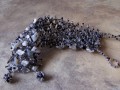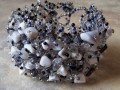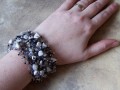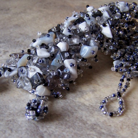 Náramek je šitý z černého, šedivého a průhledného rokajlu + rokajlu se stříbrným a šedomodrým průtahem. Je dozdoben šedými a černými skleněnými zlomky, zlomky hematitu, bílého howlitu a šedého achátu.